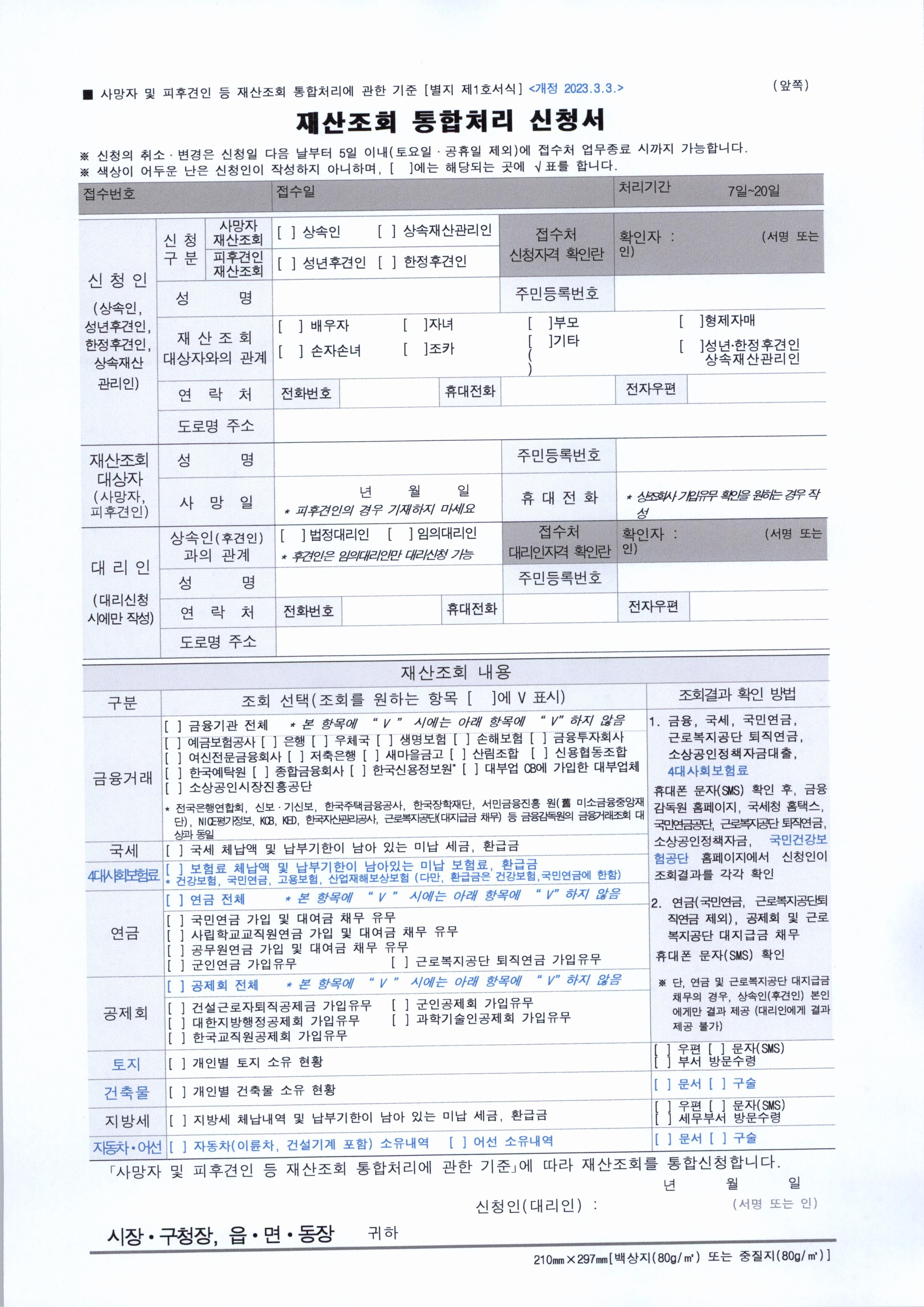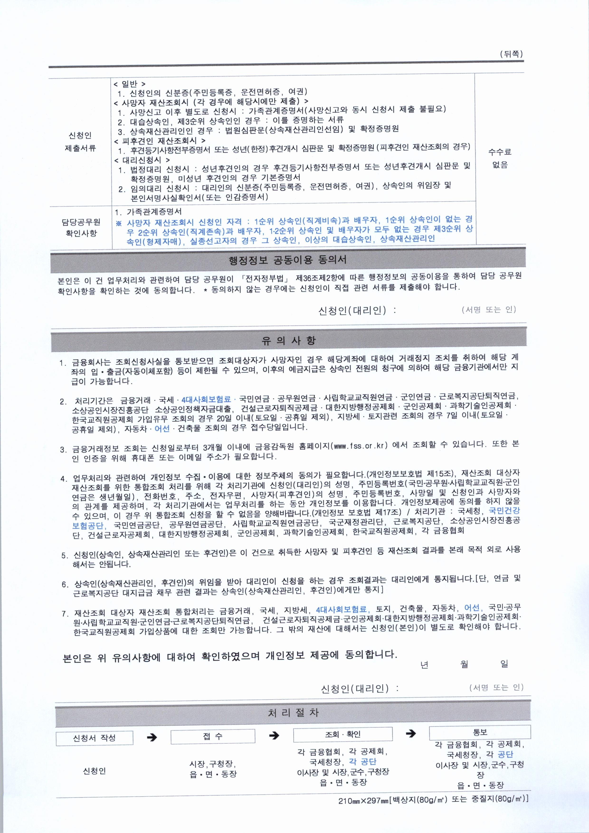 | 사망자 및 피후견인 등 재산조회 통합처리에 관한 기준 1. 금융거래 1) 은행 2) 우체국 3) 생명보험 4) 손해보험 5) 저축은행 6) 새마을 금고 7) 신용협동조합 8) 금융투자회사 등 2. 국세 3. 연금 1) 국민연금 2) 공무원연금 3) 군인연금 4) 퇴직연금 4. 토지, 건축물 5. 지방세 6. 자동차 소유내역 7. 재산조회 통합처리 신청서 |
