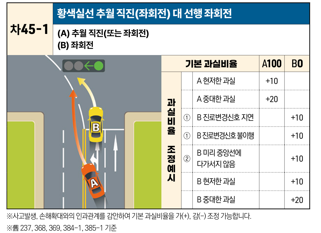⊙B차량이 정상적으로 좌회전을 하는 경우에만 적용하며, 우회전이나 정차로 후방차량이 오해하게 하는 등 이상 운전을 한 경우에는 본 기준을 적용하지 않는다.