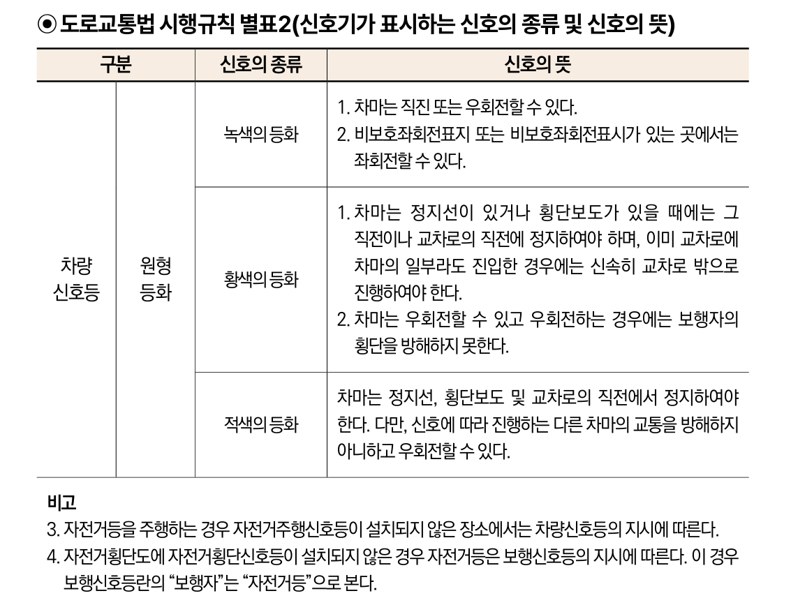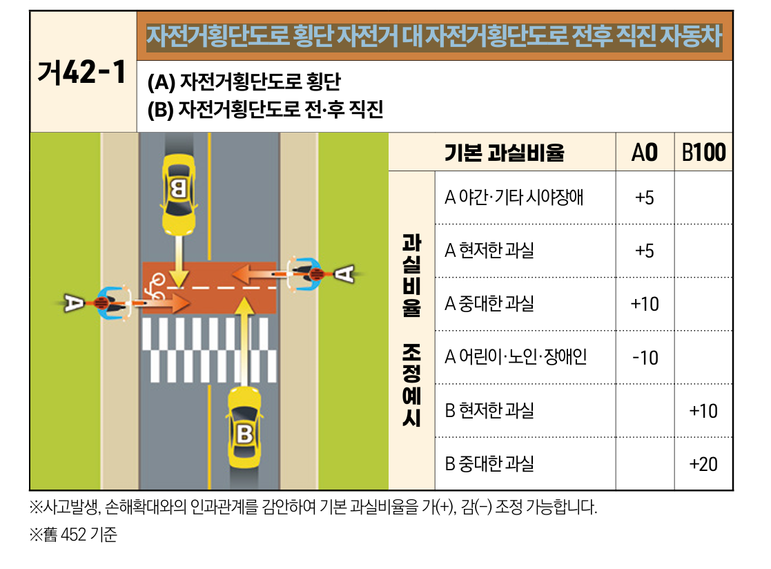 ⊙자전거 횡단도의 경우 자전거 통행신호등이 설치된 경우에는 그 녹색신호, 자전거 통행 신호등이 없는 경우 차량신호등의 녹색신호에 따라 자전거가 자전거횡단도를 탑승 횡단하는 경우이지만 교차로의 가상연결선에서 10미터내에 자전거 횡단도가 있는 경우에는 도로 교통법 시행규칙[별표2]에 따라 자전거는 차량신호 대신 보행자 신호를 자전거신호로 보고 자전거가 보행자신호에 자전거횡단도를 횡단하는 경우에만 본 기준을 적용한다. 그 외의 신호에 자전거가 자전거횡단도를 탑승하여 횡단할 경우에는 ‘V. 자동차와 자전거의 사고’ 중에서 다른 적용 가능한 기준을 적용한다.