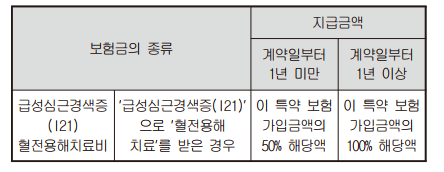 ② 회사는 피보험자가 이 특약의 보험기간 중에 ‘급성심근경색증 (I21)’으로 진단확정되고, 그‘급성심근경색증(I21)’의 치료를 직 접적인 목적으로 ‘혈전용해치료’를 받은 경우에는 최초 1회에 한하 여 아래의 금액을 보험수익자에게 보험금으로 지급합니다.