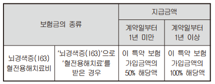 ① 회사는 피보험자가 이 특별약관의 보험기간 중에 ‘뇌경색증(I63)’으로 진단확정되고, 그‘뇌경색증(I63)’의 치료를 직접적인 목적으로 ‘혈전용해치료’를 받은 경우에는 최초 1회에 한하여 아래의 금액을 보험수익자에게 보험금으로 지급합니다.