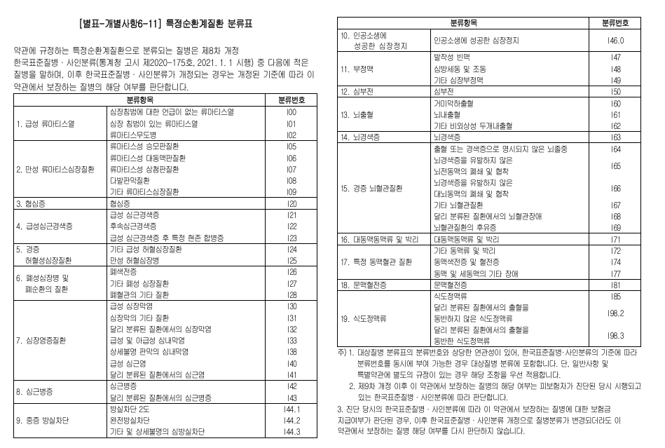 ① 이 특별약관에서「특정순환계질환」이라 함은 한국표준질병·사인분류에 있어서 [별표-개별사항6-11]특정순환계질환 분류표에서 정한 질병을 말합니다.