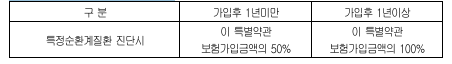 회사는 피보험자가 보험증권에 기재된 이 특별약관의 보험기간(이하「보험기간」이라 합 니다) 중에「특정순환계질환」으로 진단 확정되었을 때에는 최초 1회에 한하여 아래에 정한 금액을 특정순환계질환 진단비(1년50%)(이하 「특정순환계질환 진단비」이라 합니다)로 보험수익자에게 지급합니다.