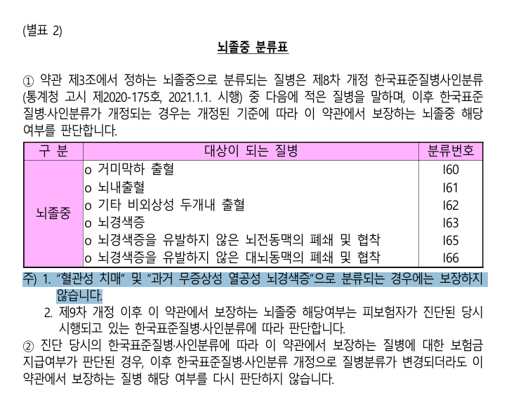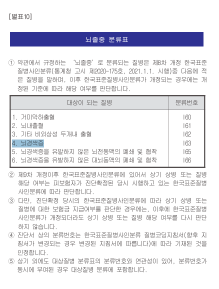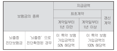 | 2-31 뇌졸중진단(간편 맞춤 고지)보장 특별약관 뇌졸중진단(간편맞춤고지)(갱신형)보장특별약관 제1조 (보험금의 지급사유) 회사는 피보험자가 이 특별약관의 보험기간 중에 ‘뇌졸중’으로 진단확 정된 경우에는 최초 1회에 한하여 아래의 금액을 보험수익자에게 보험금으로 지급합니다.(이하 ‘특별약관’은 ‘특약’, ‘이 특별약관의 보험 기간’은 ‘보험기간’이라 합니다) 제2조 (뇌졸중의 정의 및 진단확정) ① 이 특약에서 ‘뇌졸중’이라 함은 제8차 한국표준질병사인분류에 있 어서 [별표10] ‘뇌졸중 분류표’에 해당하는 질병을 말합니다. ② ‘뇌졸중’의 진단확정은 의료법 제3조(의료기관)에서 규정한 국내의 병원, 의원 또는 국외의 의료관련법에서 정한 의료기관의 의사(치과 의사 제외) 면허를 가진 자에 의하여 내려져야 하며, 이 진단은 병력 ㆍ신경학적 검진과 함께 뇌전산화단층촬영(Brain CT Scan), 자기공명 영상(MRI), 뇌혈관조영술, 양전자방출단층술(PET), 단일광자방출 전 산화 단층술(SPECT), 뇌척수액검사 등을 기초로 하여야 합니다. 그러나 피보험자가 사망하여 상기 검사방법을 진단의 기초로 할 수 없는 경우에 한하여 다음 각 호의 어느 하나에 해당하는 경우에는 진단확정이 있는 것으로 볼 수 있습니다. 1. 보험기간 중 뇌졸중으로 진단 또는 치료를 받고 있었음을 증명할 수 있는 문서화된 기록 또는 증거가 있는 경우 2. 부검감정서상 사인이 뇌졸중으로 확정되거나 추정되는 경우 제3조 (보험금 지급에 관한 세부규정) ① 피보험자가 보험기간 중에 사망하고, 그 후에 제1조(보험금의 지급사 유)에 해당하는 질병을 직접적인 원인으로 사망한 사실이 확인된 경 우에는 회사는 그 사망일을 진단확정일로 보고 제1조(보험금의 지급 사유)에 따라 보험금을 지급합니다. 다만, 회사가 제6조(약관상 보장하지 않는 원인으로 사망시 지급금) 제1항에 따라 이 특약의 사망당시 계약자적립액 및 미경과보험료를 지급한 경우에는 이미 지급한 계약자적립액 및 미경과보험료를 차감하고 그 차액을 지급합니다. ② 보험수익자와 회사가 제1조(보험금의 지급사유)의 보험금 지급사유에 대해 합의하지 못할 때는 보험수익자와 회사가 함께 제3자를 정하고 그 제3자의 의견에 따를 수 있습니다. 제3자는 의료법 제3조(의료기관)에 규정한 종합병원 소속 전문의 중에 정하며, 보험금 지급사유 판정에 드는 의료비용은 회사가 전액 부담합니다. 제4조 (보험금을 지급하지 않는 사유) 이 특약의 보험금을 지급하지 않는 사유는 보통약관 제11조(보험금을 지급하지 않는 사유) 제1항을 따릅니다. 제5조 (특약의 소멸) 피보험자에게 제1조(보험금의 지급사유)에서 정한 뇌졸중진단보험금 지 급사유가 발생하거나 피보험자가 사망한 경우 이 특약은 그 때부터 효력 이 없습니다. 제6조 (약관상 보장하지 않는 원인으로 사망시 지급금) ① 피보험자가 보험기간 중 사망하였을 경우에는 ‘보험료 및 해약환급 금 산출방법서’에서 정하는 바에 따라 회사가 적립한 이 특약의 사 망당시 계약자적립액 및 미경과보험료를 계약자에게 지급합니다. ② 제1항 및 제5조(특약의 소멸)의 ‘사망’에는 보험기간에 다음 어느 하나의 사유가 발생한 경우를 포함합니다. 1. 실종선고를 받은 경우 : 법원에서 인정한 실종기간이 끝나는 때에 사망한 것으로 봅니다. 2. 관공서에서 수해, 화재나 그밖의 재난을 조사하고 사망한 것으로 통보하는 경우 : 가족관계등록부에 기재된 사망연월일을 기준으로 합니다. 제7조 (특약의 자동갱신) 이 특별약관을 갱신형으로 가입한 경우 갱신형 특별약관의 자동갱신 제 도특별약관에 따라 갱신됩니다. 제8조 (준용규정) 이 특약에서 정하지 않은 사항은 보통약관을 따릅니다. 다만, 제15조 (중도인출금) 및 제17조(만기환급금의 지급)의 규정은 제 외합니다. |