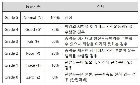 도수 근력 평가 (MMT : Manual Muscle Test) 작성자스칼렛|작성시간23.07.28|조회수695 목록 댓글 0 글자크기 작게가 글자크기 크게가 도수 근력 평가 (MMT : Manual Muscle Test) 다음검색 현재 게시글 추가 기능 열기 북마크 공유하기 신고 센터로 신고 댓글 댓글 0 댓글쓰기 답글쓰기 댓글 리스트