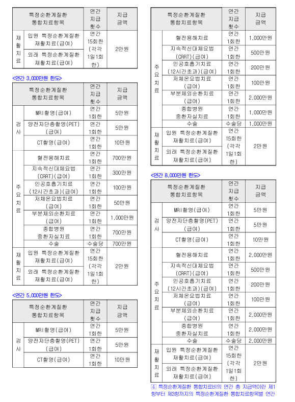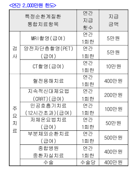 2. 회사는 보험증권에 기재된 피보험자가 이 특별약관의 보험기간 중 「특정순환계질환」으로 진단확정되고「특정 순환계질환」의 치료를 직접적인 목적으로「특정순환계질 환 통합치료(주요치료)」를 받은 경우 보험수익자에게 아래의 통합치료항목별 지급금액을 특정순환계질환 통합치 료비로 지급합니다.