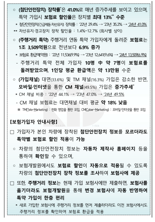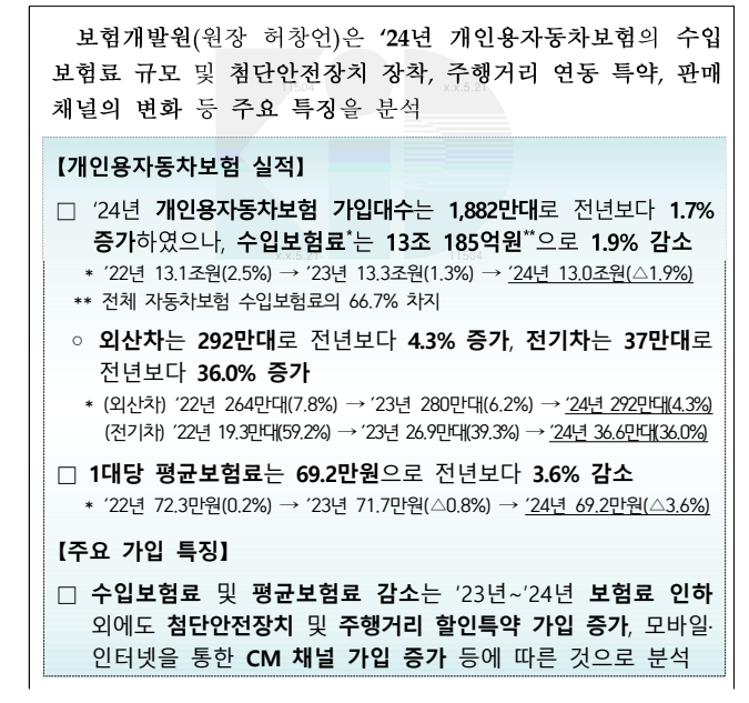 24년 개인용자동차보험 가입자의 평균보험료는 69만원으로 작년보다 3.6% 낮아졌다. 작성자채채파더|작성시간25.04.26|조회수303 목록 댓글 0 글자크기 작게가 글자크기 크게가 ‘24년 개인용자동차보험 가입자의 평균보험료는 69만원으로 작년보다 3.6% 낮아졌으며 주행거리 연동 특약 가입자에게 , 1조 3,509 억원의 보험료를 돌려주었습니다 .(보도자료) ‘24년 개인용자동차보험 가입자의 평균보험료는 69만원으로 작년보다 3.6% 감소.pdf2.79MB(보도자료) ‘24년 개인용자동차보험 가입자의 평균보험료는 69만원으로 작년보다 3.6% 감소.pdf2.79MB 첨부파일첨부된 파일이 4개 있습니다. png 파일 image.png 다운로드 png 파일 image.png 다운로드 pdf 파일 (보도자료) ‘24년 개인용자동차보험 가입자의 평균보험료는 69만원으로 작년보다 3.6% 감소.pdf 다운로드 pdf 파일 (보도자료) ‘24년 개인용자동차보험 가입자의 평균보험료는 69만원으로 작년보다 3.6% 감소.pdf 다운로드 다음검색 현재 게시글 추가 기능 열기 북마크 공유하기 신고 센터로 신고 댓글 댓글 0 댓글쓰기 답글쓰기 댓글 리스트