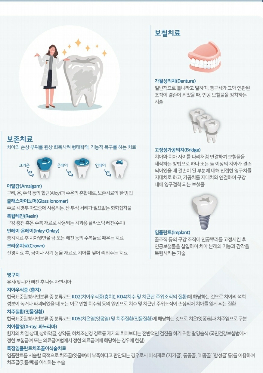 보존치료 : 때우다, 씌우다 // 보철치료 : 임플란트, 브릿지, 틀니