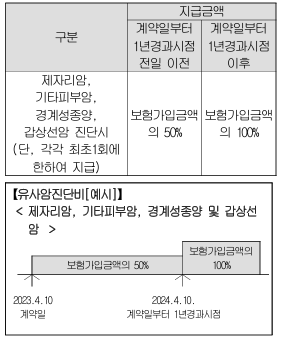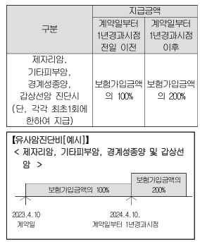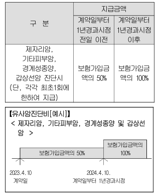1. 회사는 보험증권에 기재된 피보험자가 이 특별 약관의 보험기간 중에「제자리암」,「기타피부암」,「경계성종양」또는「갑상선암」으로 진단확 정되었을 때에는 보험수익자에게 아래의 금액을 유 사암진단비로 지급합니다. 다만, 아래의「계약일부터 1년경과시점」이라 함은 계약일부터 그 날을 포 함하여 1년이 지난날의 다음날을 말합니다.