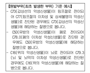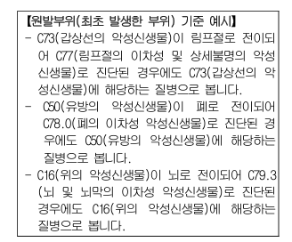 7. 한국표준질병·사인분류 지침서의 "사망 및 질 병이환의 분류번호부여를 위한 선정준칙과 지침"에 따라 C77~C80(불명확한, 이차성 및 상세불명 부위 의 악성신생물)의 경우 일차성 악성신생물(암)이 확인되는 경우에는 원발부위(최초 발생한 부위)를 기준으로 분류합니다.
