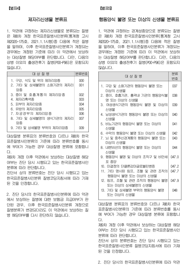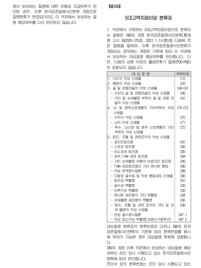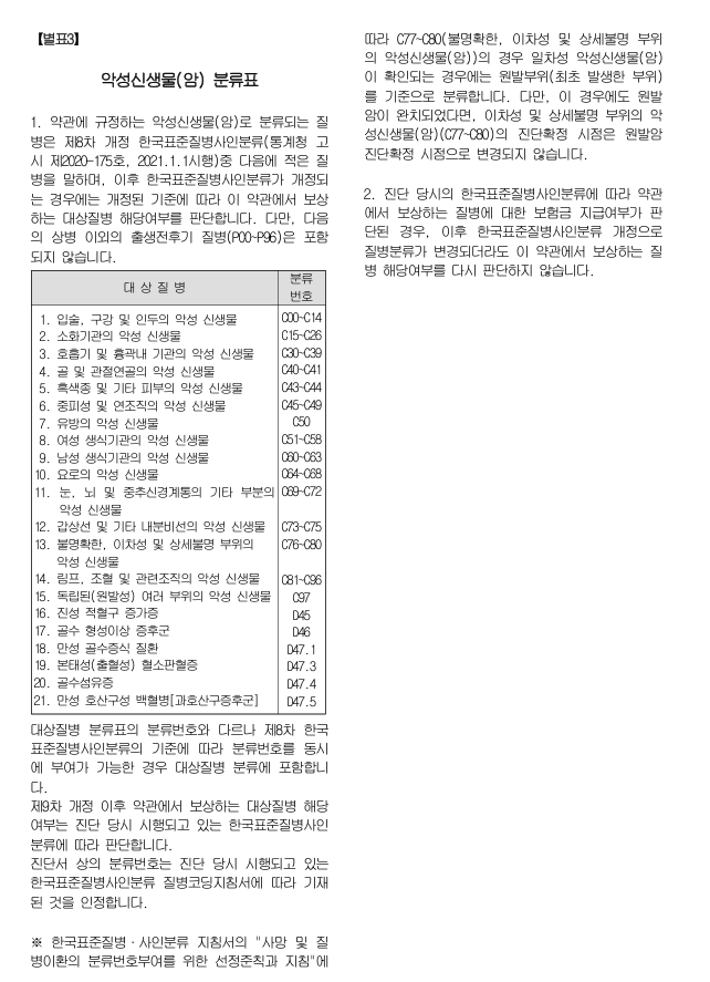 2. 진단 당시의 한국표준질병사인분류에 따라 약관 에서 보상하는 질병에 대한 보험금 지급여부가 판 단된 경우, 이후 한국표준질병사인분류 개정으로 질병분류가 변경되더라도 이 약관에서 보상하는 질병 해당여부를 다시 판단하지 않습니다