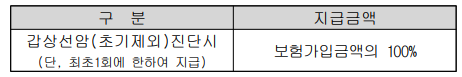 2. 1종(갱신형)으로 가입한 경우, 제1항에도 불구하고 보통 약관 제1절 일반조항 제24조(계약의 자동갱신)에 따라 보장 이 자동갱신되는 경우 피보험자가 제1항에서 정한 진단확정 시에는 보험수익자에게 최초 1회에 한하여 아래의 금액을 갑상선암(초기제외)진단비로 지급합니다.