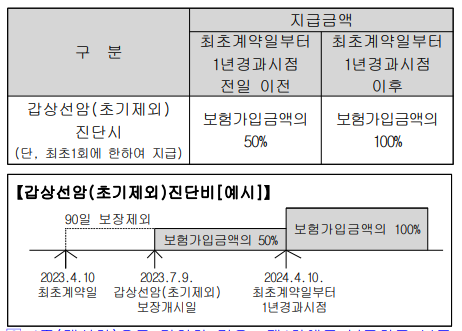 회사는 보험증권에 기재된 피보험자가 이 특별약관의 보험기간 중 갑상선암(초기제외)보장개시일 이후에「갑상선암 (초기제외)」으로 진단확정되었을 때에는 보험수익자에게 최초 1회에 한하여 아래의 금액을 갑상선암(초기제외)진단 비로 지급합니다. 다만, 아래의「최초계약일부터 1년경과시 점」이라 함은 최초계약일부터 그 날을 포함하여 1년이 지난날의 다음날을 말합니다.