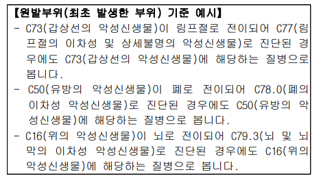 5. 한국표준질병·사인분류 지침서의 "사망 및 질병이환의 분류번호부여를 위한 선정준칙과 지침"에 따라 C77~C80(불 명확한, 이차성 및 상세불명 부위의 악성신생물)의 경우 일 차성 악성신생물(암)이 확인되는 경우에는 원발부위(최초 발생한 부위)를 기준으로 분류합니다.