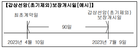 4. 이 특별약관에서 갑상선암(초기제외)보장개시일이라 함 은 최초계약일부터 그날을 포함하여 90일이 지난날의 다음 날로 합니다. 다만, 보통약관 제1절 일반조항 제24조(계약 의 자동갱신)에 따라 보장이 자동갱신되는 경우에는 이 계 약의 갱신일을 갑상선암(초기제외)보장개시일로 합니다.