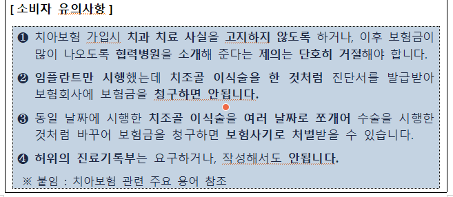 ◈ 임플란트 등 치아관련 수술 환자가 보험금 청구와 관련한 보험사기에 연루되어 처벌*받는 사례가 지속적으로 발생하고 있고 * 「보험사기방지 특별법」 제8조에 따라 10년 이하의 징역 또는 5천만원 이하의 벌금에 처함 ◦ 최근에는 설계사와 치과병원이 공모한 조직형 치아보험 사기 조직이 치아 질환이 예상되는 환자를 모집하여 보험사기에 가담시키고 있는 등 치아보험과 관련한 주의가 필요합니다. ◈ 치아보험을 이용한 보험사기 관련 판결사례를 중심으로 보험사기 예방을 위한 소비자 유의사항을 알려드립니다. [소비자 유의사항] | ||
