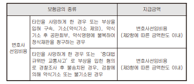 | 3-5 자동차사고변호사선임비용Ⅲ(특정사고경찰조사포함)(갱신형/비갱신형)보장 특별약관 제1조 (보험금의 지급사유) ① 회사는 피보험자가 이 특별약관(이하 ‘특별약관’은 ‘특약’, ‘이 특별약관의 보험기 간’은 ‘보험기간’이라 합니다)의 보험기간 중에 자동차 운전중 발생한 급격하고도 우 연한 자동차사고로 타인의 신체에 상해를 입힘으로써 아래에서 정한 사유에 따라 변호사 선임비용으로 실제로 부담한 금액(이하‘변호사선임비용)을 1사고마다 아래의 금액을 한 도로 보험수익자(수익자의 지정이 없을 때에는 피보험자)에게 지급합니다. 1. 피보험자가 구속영장에 의하여 구속되는 경우 2. 검찰에 의해 공소제기(이하 ‘기소’라 합니다. 단, 약식기소는 제외합니다)된 경우 3. 피보험자가 검사에 의해 약식기소 되었으나 법원에 의해 보통의 심판절차인 공판절차 에 의해 재판이 진행하게 된 경우 4. 검사 또는 피보험자가 법원의 약식명령에 불복하여 정식재판을 청구하는 경우 5. 피보험자가 타인을 사망하게 하거나 ‘중대법규위반 교통사고’로 타인의 신체에 상해를 입힌 혐의로 경찰조사 후 불송치된 경우(검찰의 보완수사 요구로 수사후 송치되는 경우는 제외합니다.) 6. 피보험자가 타인을 사망하게 하거나 ‘중대법규위반 교통사고’로 타인의 신체에 상해를 입힌 혐의로 검찰에 의해 약식기소 또는 불기소된 경우 1. 타인이 사망 또는 ‘중대법규위반 교통사고’로 자동차손해배상보장법 시행령 제3조 에서 정한 [별표15] ‘자동차사고 부상등급표’의 상해등급 중 1급 내지 3급에 해당 하는 부상을 입은 경우 보험가입금액을 한도로 보상 2. 타인이 제1호 이외의 사고로 부상을 입은 경우 보험가입금액과 3천만원 중 적은 금액을 한도로 보상 3. 1사고로 다수의 피해자가 제1호 및 제2호에 해당하는 경우 높은 보상한도를 기준으로 보험금을 지급합니다. ③ 제1항 제5호 또는 제6호의 변호사선임비용은 1사고마다 각 호의 금액을 한도로 지급합니 다. 1. 타인이 사망 또는 ‘중대법규위반 교통사고’로 자동차손해배상보장법 시행령 제3조 에서 정한 [별표15] ‘자동차사고 부상등급표’의 상해등급 중 1급 내지 3급에 해당 하는 부상을 입은 경우 보험가입금액과 5천만원 중 큰 금액을 한도로 보상 2. 타인이‘중대법규위반 교통사고’로 자동차손해배상보장법 시행령 제3조에서 정한 [별표15] ‘자동차사고 부상등급표’의 상해등급 중 4급 내지 7급에 해당하는 부상 을 입은 경우 3천만원을 한도로 보상 3. 타인이‘중대법규위반 교통사고’로 자동차손해배상보장법 시행령 제3조에서 정한 [별표15] ‘자동차사고 부상등급표’의 상해등급 중 8급 내지 14급에 해당하는 부상 을 입은 경우 보험가입금액이 5천만원 이하인 경우 5백만원을 한도로 보상하며, 보험가입금액이 5천만원을 초과하는 경우 1천만원을 한도로 보상 4. 1사고로 다수의 피해자가 제1호 내지 제3호에 해당하는 경우 높은 보상한도를 기준으 로 보험금을 지급합니다. 제2조 (자동차 운전중 등의 정의) ① 이 특약에서 ‘자동차 운전중’이라 함은 도로여부, 주정차여부, 엔진의 시동여부를 불 문하고 피보험자가 자동차 운전석에 탑승하여 핸들을 조작하거나 조작 가능한 상태에 있 는 것을 말합니다. ② 제1항에서 ‘자동차’라 함은 다음의 어느 하나에 해당하는 것을 말합니다. 1. 자동차관리법 시행규칙 제2조에 정한 승용자동차, 승합자동차, 화물자동차, 특수자동 차, 이륜자동차 2. 자동차손해배상보장법 시행령 제2조에 정한 건설기계(덤프트럭, 타이어식 기중기, 콘 크리트믹서트럭, 트럭적재식 콘크리트펌프, 트럭적재식 아스팔트살포기, 타이어식 굴 삭기, 트럭지게차, 도로보수트럭, 노면측정장비) ③ 이 특약에서 ‘구속’이라 함은 형사소송법상 피고인 또는 피의자 신체의 자유를 제한하 는 대인적 강제처분을 말합니다. ④ 이 특약에서 ‘기소’라 함은 검사가 특정형사건에 관하여 법원에 재판을 청구하는 소송 행위를 말합니다. ⑤ 이 특약에서 ‘약식기소’라 함은 검사가 지방법원의 관할사건에 대하여 보통의 심판절 차인 공판절차를 거치지 않고 피고인에게 벌금, 과료 또는 몰수의 형을 과하는 것이 타 당하다고 판단하여 약식명령공소장에 의하여 기소하는 것을 말합니다. ⑥ 제1조(보험금의 지급사유)의 ‘1사고’라 함은 하나의 자동차 운전 중 교통사고를 말하 며, ‘1사고’로 경찰조사, 검찰조사 및 항소심, 상고심을 포함한 다수의 소송과정에서 피보험자가 부담한 전체 변호사선임비용을 합쳐서 제1조(보험금의 지급사유) 제2항 및 제3항의 금액을 한도로 보험수익자(보험금을 받는 자, 수익자의 지정이 없을 때에는 피 보험자)에게 지급합니다. ⑦ 이 특약에서 ‘중대법규위반 교통사고’라 함은 교통사고처리특례법 제3조 제2항 단서 ([별표14] 참조)에 해당되는 사고의 직접결과로써 타인이 자동차손해배상보장법 시행령 제3조에서 정한 [별표15] ‘자동차사고 부상등급표’의 상해등급을 받은 경우를 말하며 불송치 결정서, 약식명령 공소장, 불기소이유고지서 또는 피의자 처분결과 통지서 등에 기재된 죄목