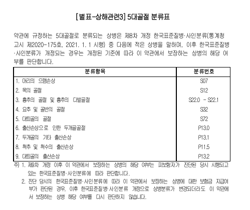 ② 제1항의 5대골절 진단비는 매사고 마다 지급합니다. 다만, 동일한 상해사고를 직접적 인 원인으로 2가지 이상의 5대골절 상태가 발생한 경우에는 1회에 한하여 보상합니다.