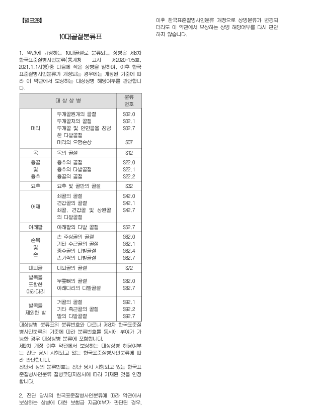 회사는 보험증권에 기재된 피보험자가 이 특별약관의 보험기간 중에 상해의 직접결과로써【별표28(10 대골절분류표)】에서 정하는 10대골절로 진단확정 시 보험수익자에게 1사고당 이 특별약관의 보험가입금액을 10대골절진단비로 지급합니다.
