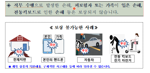 | ◈직무 수행으로 발생한 손해, 피보험자 또는 가족이 입은 손해, 전동킥보드로 인한 손해 등은 보상되지 않습니다. |