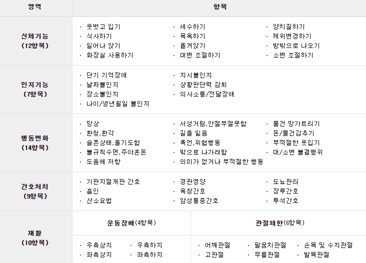 옷벗고 입기, 식사하기, 일어나 앉기, 화장실 사용하기, 세수하기, 옮겨앉기, 대변 조절하기, 양치질하기, 체위변경하기, 방밖으로 나오기, 소변조절하기