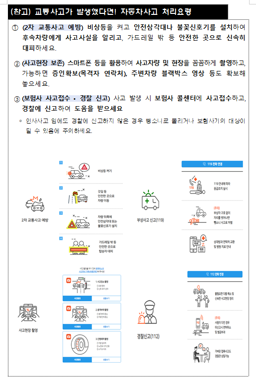 ◦ 설 연휴 배터리 방전, 연료소진, 타이어 펑크 등 예상치 못한 자동차고장 긴급 발생 시 해당 차량이 가입되어 있는 자동차보험사에 전화 한 통으로 24시간 긴급출동 서비스를 이용하여 신속하게 도움을 받을 수 있습니다.