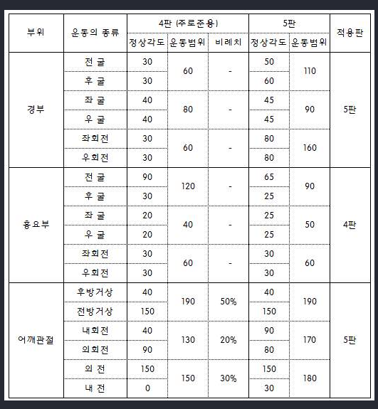 | * 팔[어깨관절]/다리관절의 수동운동범위[AMA방식] 어깨관절[굴곡, 신전, 외전, 내전, 내회전, 외회전] 1) 전방거상[굴곡] 2) 후방거상[신전] 3) 측방거상[외전] * 팔의 장해(2018년 4월 1일 이전 지급률과 장해판정기준) 1. 장해의 분류 장해의 분류 지급률 1) 두 팔의 손목 이상을 잃었을 때 100% 2) 한 팔의 손목 이상을 잃었을 때 60% 3) 한 팔의 3대 관절 중 관절 하나의 기능을 완전히 잃었을 때 30% 4) 한 팔의 3대 관절 중 관절 하나의 기능에 심한 장해를 남긴 때 20% 5) 한 팔의 3대 관절 중 관절 하나의 기능에 뚜렷한 장해를 남긴 때 10% 6) 한 팔의 3대 관절 중 관절 하나의 기능에 약간의 장해를 남긴 때 5% 7) 한 팔에 가관절이 남아 뚜렷한 장해를 남긴 때 20% 8) 한 팔에 가관절이 남아 약간의 장해를 남긴 때 10% 9) 한 팔의 뼈에 기형을 남긴 때 5% 2. 장해판정기준 1) 골절부에 금속내고정물 등을 사용하였기 때문에 그것이 기능장해의 원인이 되는 때에는 그 내고정물 등이 제거된 후 장해를 판정한다. 2) 관절을 사용하지 않아 발생한 기능장해(예컨대 석고붕대(cast)로 환부를 고정시켰기 때문에 치유 후의 관절에 기능장해가 생긴 경우)와 일시적인 장해는 장해보상을 하지 않는다. 3) ‘팔’이라 함은 어깨관절(肩關節)부터 손목관절까지를 말한다. 4) ‘팔의 3대 관절’이라 함은 어깨관절, 팔꿈치관절 및 손목관절을 말한다. 5) ‘한 팔의 손목 이상을 잃었을 때’라 함은 손목관절부터 심장에 가까운 쪽에서 절단된 때를 말하며, 팔꿈치 관절 상부에서 절단된 경우도 포함된다. 6) 팔의 관절기능장해 평가는 팔의 3대 관절의 관절운동범위 제한 등으로 평가한다. 각 관절의 운동범위 측정은 미국의사협회(A.M.A.) ‘영구적 신체장해 평가지침’의 정상각도 및 측정방법 등을 따르며, 관절기능장해를 표시할 경우에는 장해부위의 장해각도와 정상부위의 측정치를 동시에 판단하여 장해상태를 명확히 한다. 가) ‘기능을 완전히 잃었을 때’라 함은 ① 완전 강직(관절굳음) 또는 인공관절이나 인공골두를 삽입한 경우 ② 근전도 검사상 완전마비 소견이 있고 근력검사에서 근력이 ‘0등급(Zero)’인 경우 나) ‘심한 장해’라 함은 ① 해당 관절의 운동범위 합계가 정상 운동범위의 1/4 이하로 제한된 경우 ② 근전도 검사상 심한 마비 소견이 있고 근력검사에서 근력이 ‘1등급(Trace)’인 경우 다) ‘뚜렷한 장해’라 함은 ① 해당 관절의 운동범위 합계가 정상 운동범위의 1/2 이하로 제한된 경우 라) ‘약간의 장해’라 함은 ① 해당 관절의 운동범위 합계가 정상 운동범위의 3/4 이하로 제한된 경우 7) ‘가관절이 남아 뚜렷한 장해를 남긴 때’라 함은 상완골에 가관절이 남은 경우 또는 요골과 척골의 2개 뼈 모두에 가관절이 남은 경우를 말한다. 8) ‘가관절이 남아 약간의 장해를 남긴 때’라 함은 요골과 척골 중 어느 한 뼈에 가관절이 남은 경우를 말한다. 9) ‘뼈에 기형을 남긴 때’라 함은 상완골 또는 요골과 척골에 변형이 남아 정상에 비해 부정유합된 각 변형이 15° 이상인 경우를 말한다. 3. 지급률의 결정 1) 1상지(팔과 손가락)의 후유장해지급률은 원칙적으로 각각 합산하되, 지급률은 60% 한도로 한다. 2) 한 팔의 3대 관절 중 관절 하나에 기능장해가 생기고 다른 관절 하나에 기능장해가 발생한 경우 지급률은 각각 적용하여 합산한다. |