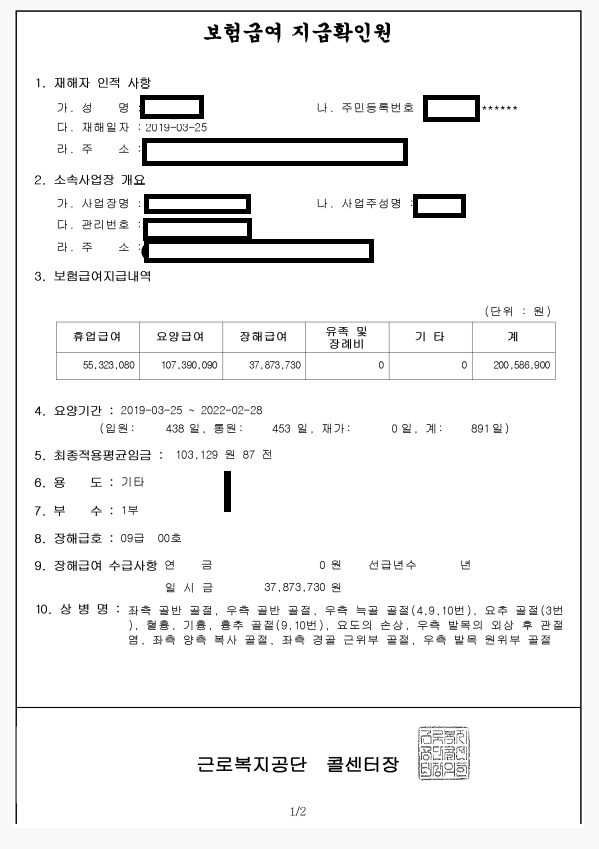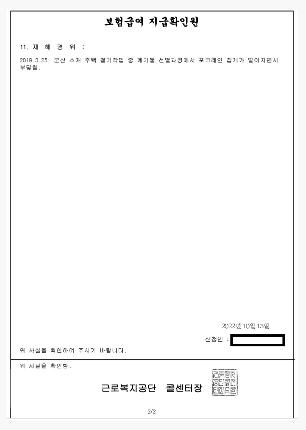 | * 산재 보험급여 지급확인원 발급신청방법 1. 산재 피해자가 근로복지공단 콜센터에 전화 전화번호 1588-0075 2. 상담원 연결 3. 산재 피해자 본인 확인 성명, 주민번호, 요양한 병원 등 확인 4. 산재 보험급여지급확인원 서식을 수신 받을 팩스번호 답변 5. 안내 문자수신과 함께, 산재 보험급여 지급확인원 발급 완료. |