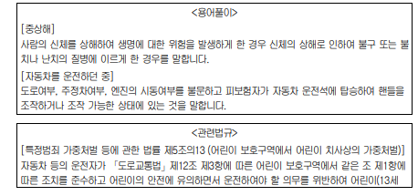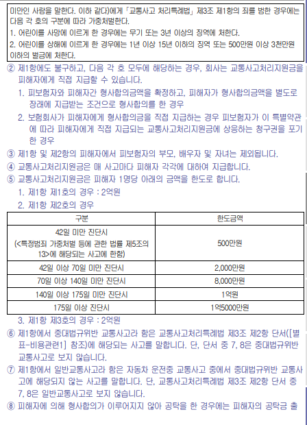 2. 중대법규위반 교통사고로 피해자가 42일(피해자 1명을 기준으로 합니다) 이상 치 료를 요한다는 진단을 받은 경우. 다만, 특정범죄 가중처벌 등에 관한 법률 제5조 의 13(어린이 보호구역에서 어린이 치사상의 가중처벌)에 해당되는 사고에 한하여 피해자가 42일 미만 치료를 요한다는 진단을 받은 경우도 포함합니다.