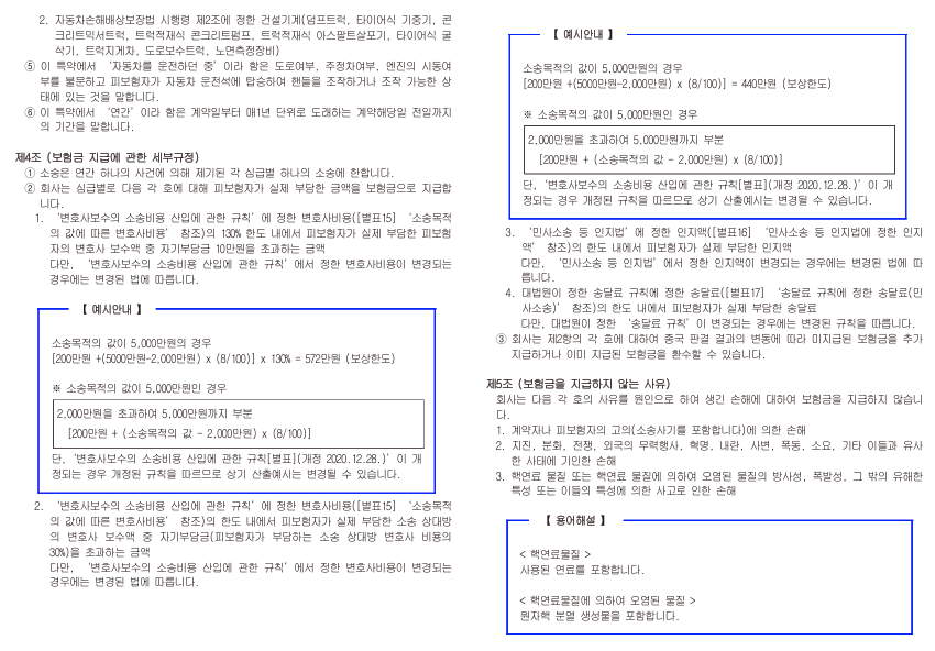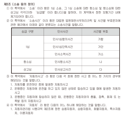회사는 이 특별약관의 보험기간 중에 피보험자(보험대상자)에게 자동차사고와 관련된 소송제기의 원인이 되는 사건이 발생하여, 소송사건(대법원 법원재판사무처리규칙 및 사건별 부 호문자에 관한 예규에서 제3조(소송 등의 정의) 제2항과 같이 분류되는 소송사건 중 제기된 소장에 자동차사고와 관련된 소송에 한합니다)이 보험기간 중에 대한민국 법원에 제기되어 그 소송이 판결, 소송상 조정 또는 소송상 화해로 종료되고 피보험자가 소송비용을 부담하는 것으로 판결 또는 결정이 내려진 경우 1사고당 아래의 금액을 보험수익자에게 보험금으로 지급합니다.(이하 ‘특별약관’은 ‘특약’, ‘이 특별약관의 보험기간’은 ‘보험기 간’이라 합니다)