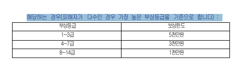 ④ 제1항 내지 제3항에서 중대법규위반 교통사고라 함은 불송치 결정서, 불기소 이유고 지서 또는 피의자 처분결과 통지서 등을 통해 죄목 또는 사고내용이 교통사고처리특 례법 제3조 2항 단서에 해당하면서 타인의 신체에 상해를 입혀 그 직접적인 결과로서 [별표-개별사항30-2]자동차사고 부상 등급표에서 정한 상해등급을 받은 경우를 말합 니다. 단, 교통사고처리특례법 제3조 제2항 단서 중 7, 8은 중대법규위반 교통사고로 보지 않습니다.