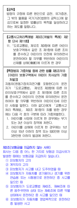 1. 제1조(보험금의 지급사유) 제1항 제2호에서「중대법규위반 교통사고」라 함은 교통사고처리특례법 제3조 제2항 단서에 해당되는 사고를 말합니다. 단, 단서 중 7, 8은 중대법규위반 교통사고로 보지 않습니다.