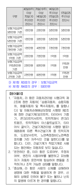 ③ 일반교통사고로 피해자에게 중상해를 입혀 형법 제258조 제1항 또는 제2항 및 형법 제268 조, 교통사고처리특례법 제3조에 따라 검찰에 의해 공소제기(이하「기소」라 합니다)되거나 자동차손해배상보장법 시행령 제3조 제1항 제 2호 별표1에서 정한 상해급수 1급, 2급 또는 3급에 해당하는 부상을 입힌 경우