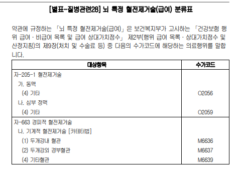 ⑤ 「뇌 특정 혈전제거술(급여)」는「국민건강보험법」에서 정한 요양급여 또는「의료급 여법」에서 정한 의료급여의 절차를 거쳐 급여항목이 발생한 경우를 말합니다.