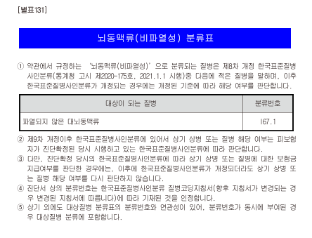 ① 이 특별약관에서 ‘뇌동맥류(비파열성)’이라 함은 제8차 한국표준질병사인분류표에 있어서 [별표131] “뇌동맥류(비파열성) 분류표”에 해당하는 질병을 말합니다. 이 때, “선천성(비파열성) 대뇌동맥류(Q28.3)”는 보장하지 않으며, “파열되지 않은 대뇌동맥 의 박리(I67.0)”와 “기타 대뇌전 동맥의 동맥류 및 박리(I72.5)”도 제외됩니다.