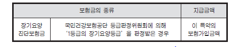 ① 회사는 피보험자가 이 특별약관의 보험기간 중에 노인장기요양보험 수급대상으로 인정되어 국민건강보험공단 등급판정위원회에 의해 1등급의 장기요양등급을 판정받은 경우에는 최초 1회에 한하여 아래의 금액을 보험수익자에게 보험금으로 지급합니다.(이하‘특별약관’은 ‘특약’, ‘이 특별약관의 보험기간’은 ‘보험기간’이라 합니다)