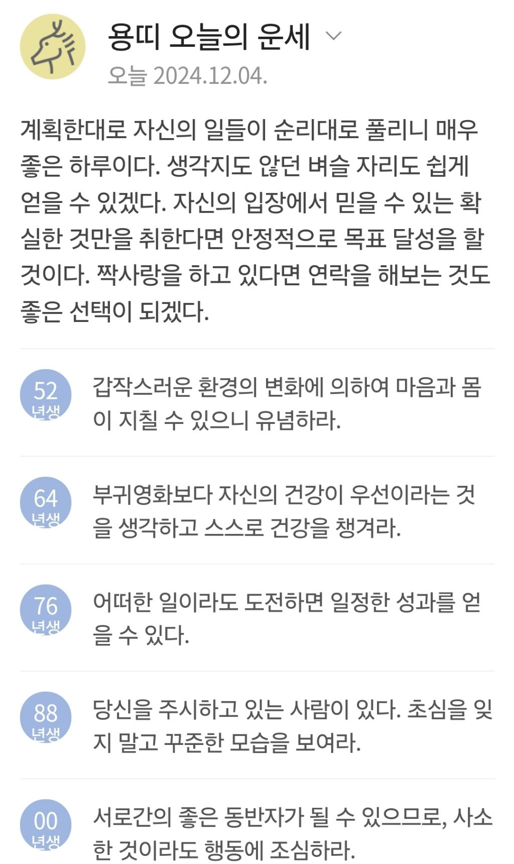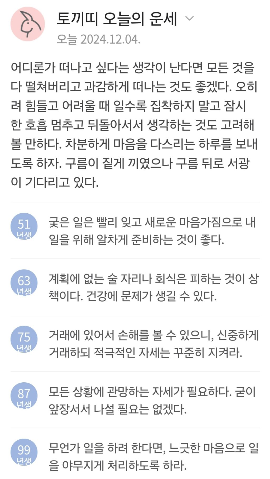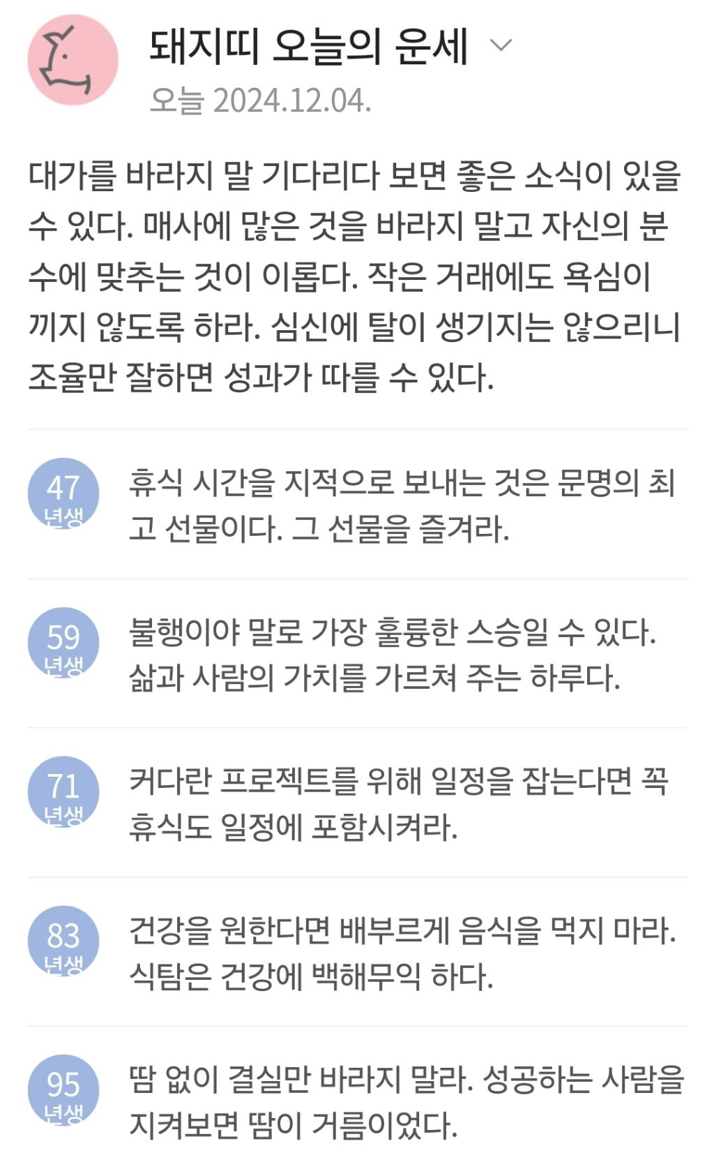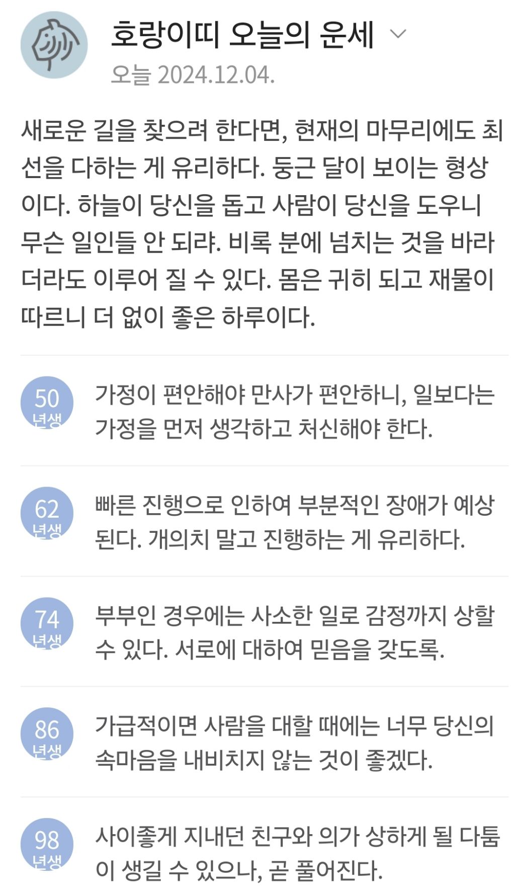 오늘운세 작성자행복한오드리|작성시간24.12.04|조회수28 목록 댓글 5 글자크기 작게가 글자크기 크게가 다음검색 현재 게시글 추가 기능 열기 북마크 공유하기 신고 센터로 신고 댓글 댓글 5 댓글쓰기 답글쓰기 댓글 리스트 작성자최준호 | 작성시간 24.12.04 경청 작성자최준호 | 작성시간 24.12.04 소통 작성자최준호 | 작성시간 24.12.04 협업 작성자최준호 | 작성시간 24.12.04 할수있다 작성자최준호 | 작성시간 24.12.04 하면된다 댓글 전체보기