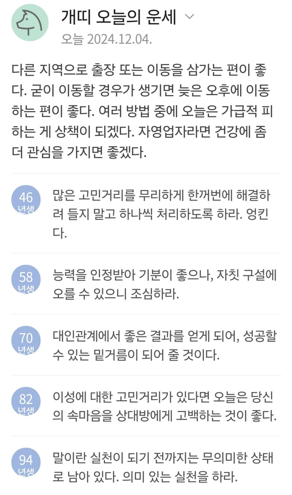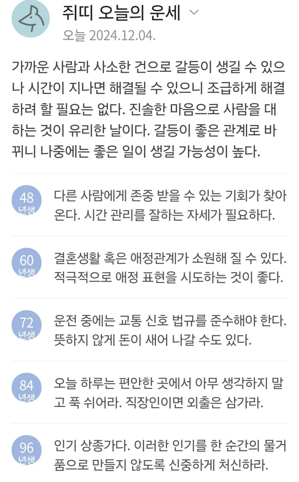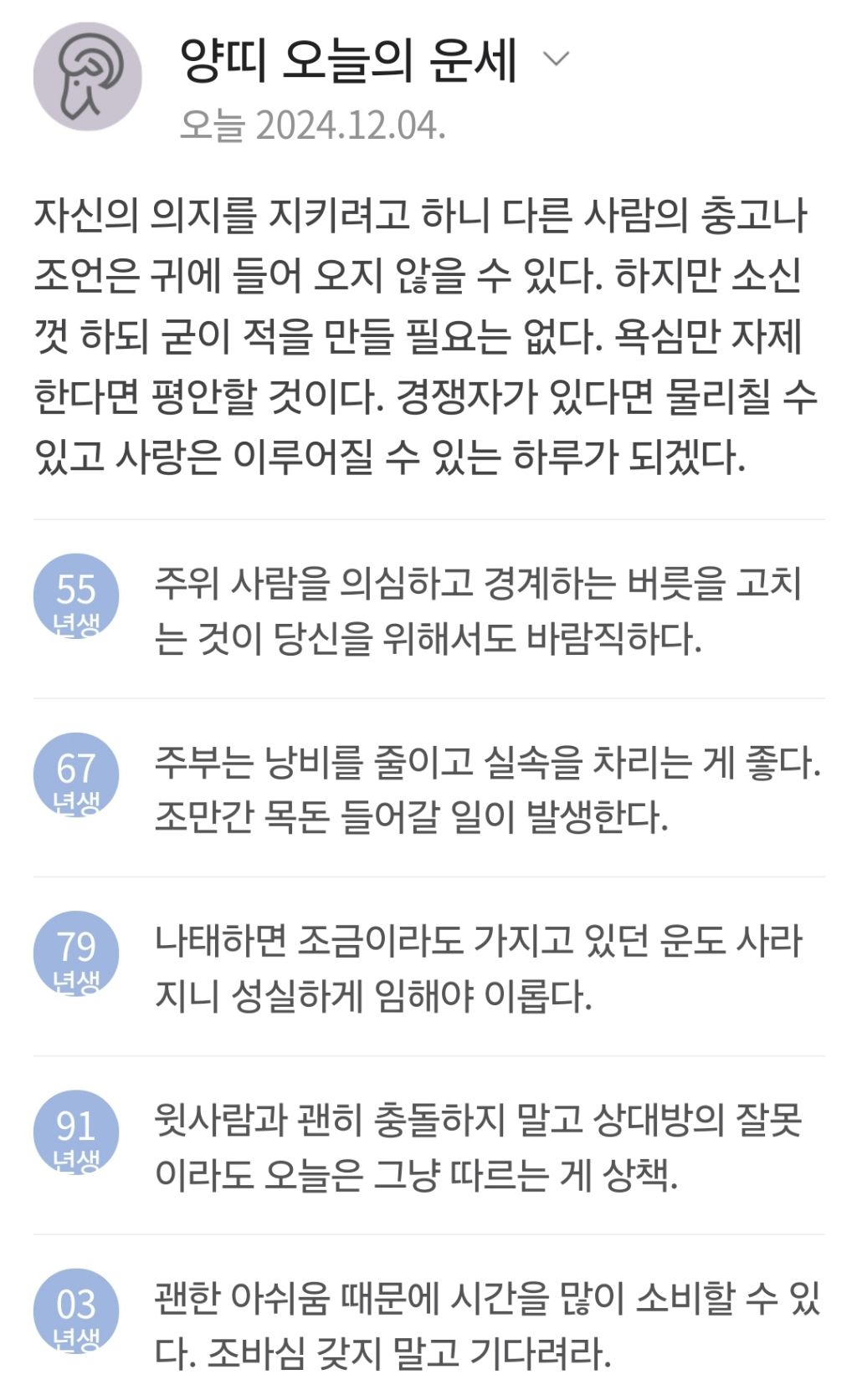오늘운세 작성자행복한오드리|작성시간24.12.04|조회수28 목록 댓글 5 글자크기 작게가 글자크기 크게가 다음검색 현재 게시글 추가 기능 열기 북마크 공유하기 신고 센터로 신고 댓글 댓글 5 댓글쓰기 답글쓰기 댓글 리스트 작성자최준호 | 작성시간 24.12.04 경청 작성자최준호 | 작성시간 24.12.04 소통 작성자최준호 | 작성시간 24.12.04 협업 작성자최준호 | 작성시간 24.12.04 할수있다 작성자최준호 | 작성시간 24.12.04 하면된다 댓글 전체보기