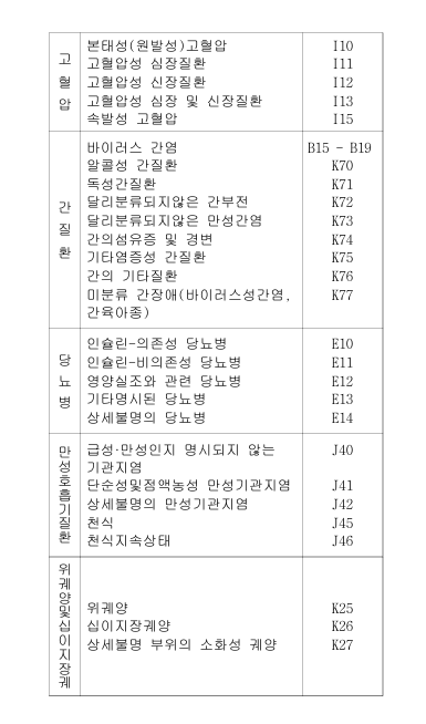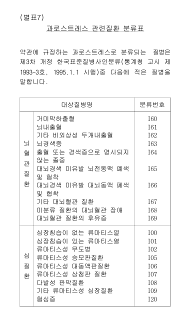 ① 이 계약에 있어서 “과로스트레스 관련질 환”이라 함은 한국표준질병사인분류중 별표 7(과로스트레스 관련질환 분류표)에서 정한 질병을 말합니다.