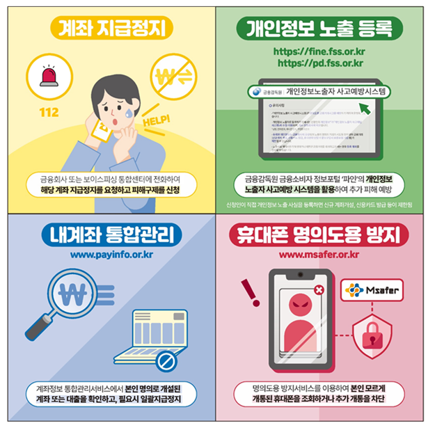 ◦피싱사이트에 개인정보를 입력한 경우 대포폰 개통 등 개인정보 유출에 따른 추가 피해가 우려되므로, 금융감독원의 「개인정보노출자 사고예방시스템」에 개인정보 노출 사실을 등록