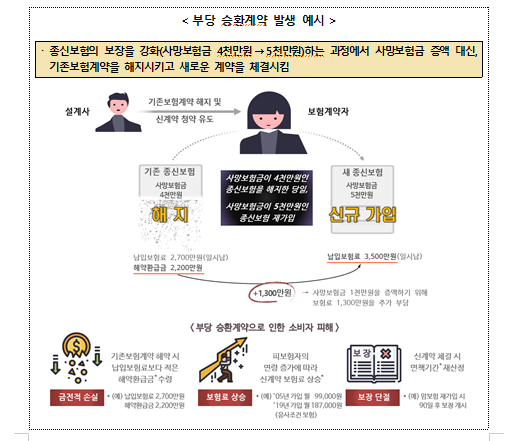 □(개념) 부당승환이란 기존보험계약을 부당하게 소멸시키면서 신계약을 청약하게 하거나, 신계약을 청약하게 한 후 기존보험계약을 부당하게 소멸시키는 행위(소위 ‘보험 갈아타기’)를 의미합니다.