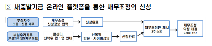 ㅇ 부실우려차주(부실차주의 담보채무 포함) 확인은 새출발기금 온라인 플랫폼(새출발기금.kr)을 통해 이루어지며, 이후 신용회복위원회의 상담(최대 2주 이내)을 거쳐 채무조정 신청이 완료됩니다.