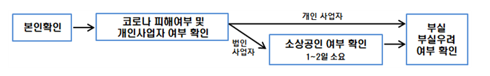 - 법인 소상공인은 온라인 플랫폼에서 채무자 정보(사업자등록번호 등)입력만으로 채무조정 대상 자격 요건중 ①코로나 피해여부를 즉시확인할 수 있으며 ②소상공인·③부실 또는 부실우려차주 여부는 1-2일 후 확인*이 가능합니다.