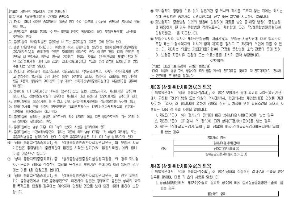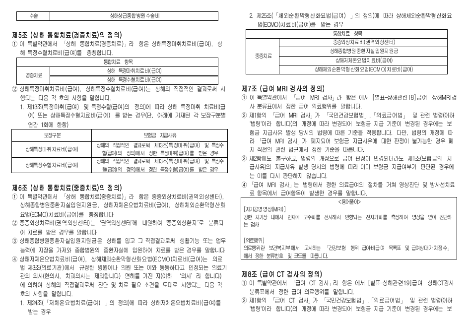 ① 회사는 피보험자가 보험증권에 기재된 이 특별약관의 보험기간(이하「보험기간」이라 합니다) 중에 제2항에서 정한 「각 통합치료 항목별 지급사유」에 따라 각 통합치료를 받은 경우 아래에서 정한 각 통합치료 항목별 지급금액을 각 항목별 지급횟수에 따라 상해 통합치료비 보험금으로 보험수익자에게 지급합니다.