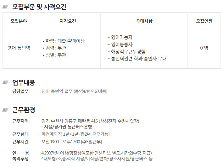 스탭스 (주) [삼성전자 수원] 영어 통번역 채용모집(~3/20) 작성자취업포털사람인ㅇ|작성시간18.03.19|조회수229 목록 댓글 0 글자크기 작게가 글자크기 크게가 >> 채용원문(링크) 확인하세요 << 다음검색 현재 게시글 추가 기능 열기 북마크 공유하기 신고 센터로 신고 댓글 댓글 0 댓글쓰기 답글쓰기 댓글 리스트
