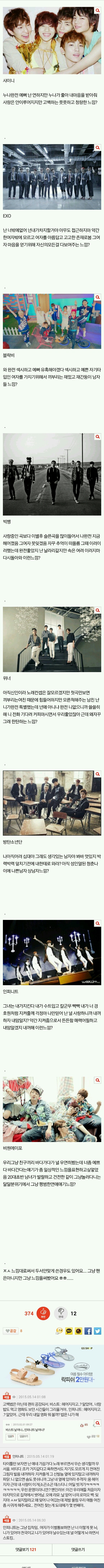 [외(外)]각 남자아이돌그룹 사랑고백법 작성자태오와유진이|작성시간15.05.15|조회수484 목록 댓글 4 글자크기 작게가 글자크기 크게가 http://cafe.daum.net/inthepalace1궁 인 ( 宮 人 ) : 궁 에 사 는 사 람 들ㅊㅊ:ㄴㅇㅌㅍ 다음검색 현재 게시글 추가 기능 열기 북마크 공유하기 신고 센터로 신고 댓글 댓글 4 댓글쓰기 답글쓰기 댓글 리스트 작성자이태민. | 작성시간 15.05.15 인비니두 도령들은ㄱㄱㄱㄱㄱㄱㄱㄱ소인도 그렇게 생각했소ㄱㄱㄱㄱ 작성자짜라짠짠 | 작성시간 15.05.15 어쨌든 다 내남친 작성자허윤 | 작성시간 15.05.15 날 떠나? 작성자이제너를위해 | 작성시간 15.05.16 샤이니 엑소 빅뱅 인피니트 좋소 댓글 전체보기
