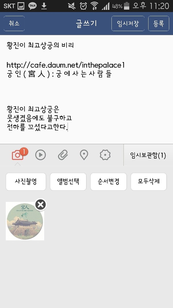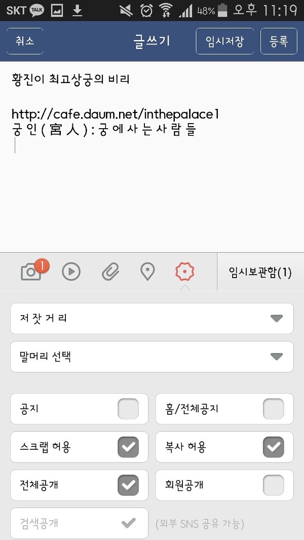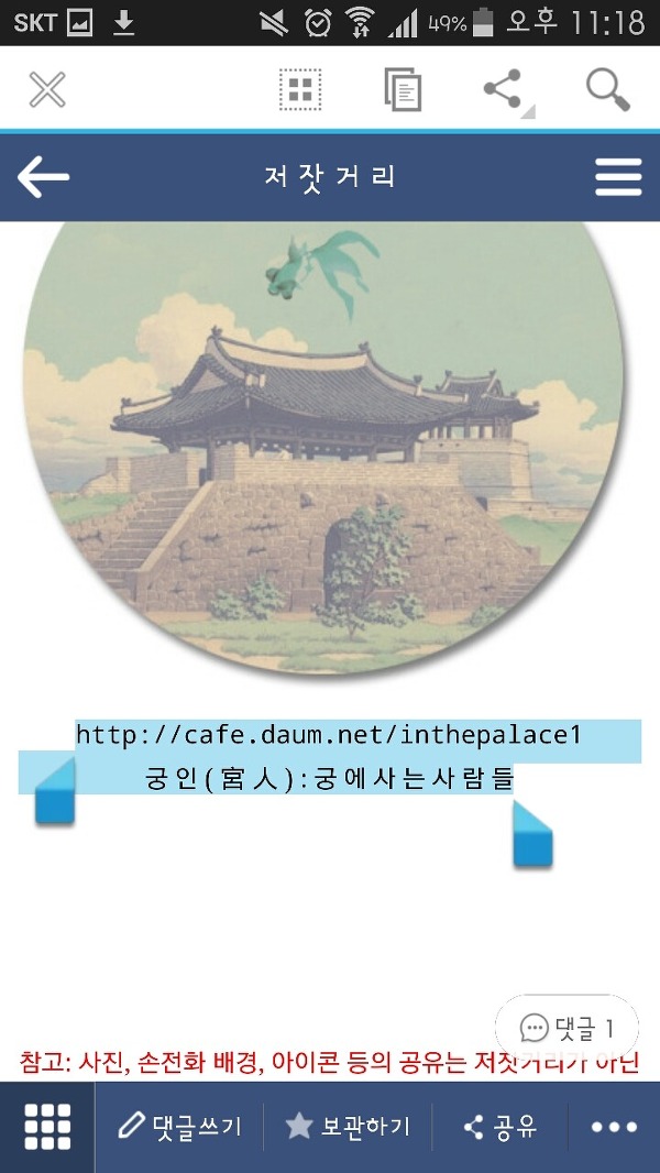 그리고 밑에 있는 궁인 주소와 글귀를 꾹 눌러서 복사할만큼 드래그 한 다음에 맨 상위에 있는 아이콘 중 두번째것을 누르시오.