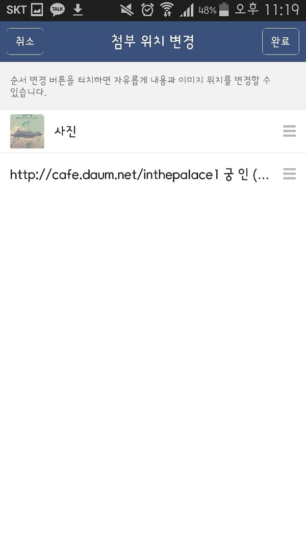 사진기 모양 아이콘을 누른 다음에 순서변경을 눌러주시오