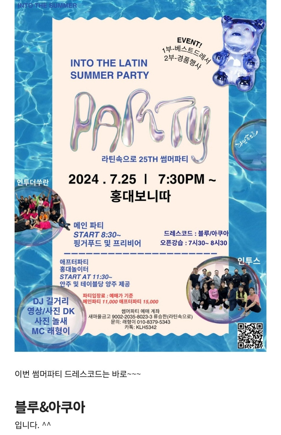 드디어 썸머파티 하는 날 용기를 내보았습니다. 함께하는 동기 친구가 있음에 용기를 내는 즐거움을 가지고 씩씩하게 살사바에 들어갔답니다.