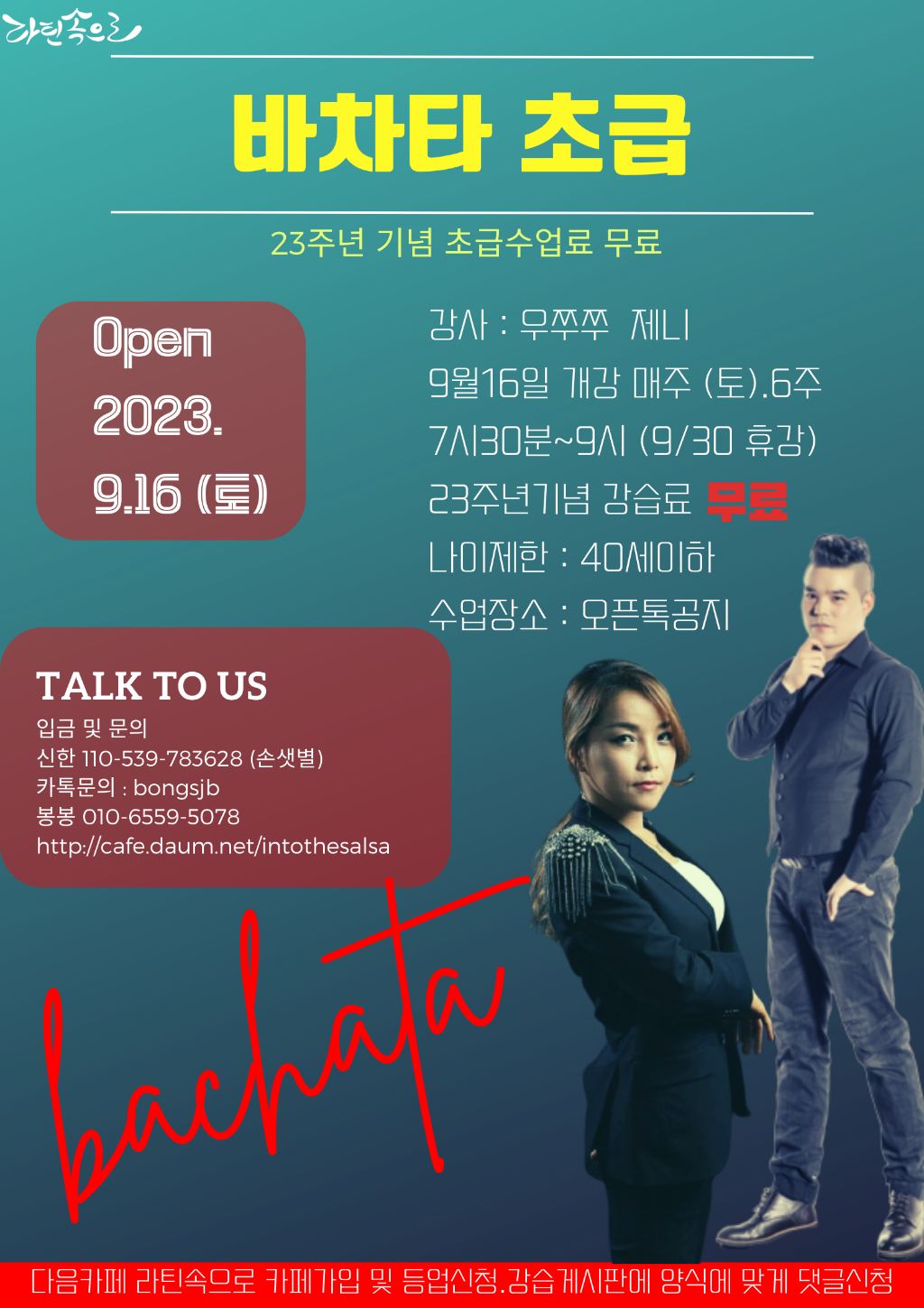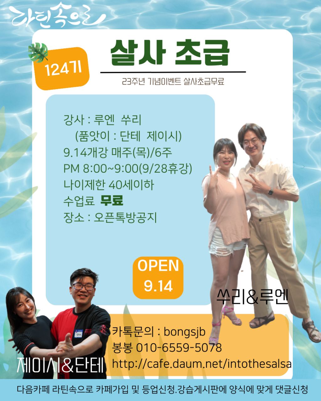| ○ 살사 124기 초급 - 강사: 루엔쌤 쑤리쌤 (보조강사: 단테쌤 제이시쌤) - 개강일: 9월14일(목) - 수업시간: 6주 목요일 오후 8시~9시 → 추석연휴(9월28일)휴강 - 수업료: 23주년 기념 완전 무료 - 장소: 홍대입구 근처 연습실 (추후 별도 공지) https://cafe.daum.net/intothesalsa/dgfZ/532 | ○ 바차타 초급 - 강사: 우쭈쭈쌤 제니쌤 - 개강일: 9월16일(토) - 수업시간: 6주 토요일 오후 7시30분~9시 → 추석연휴(9월30일)휴강 - 수업료: 23주년 기념 완전 무료 - 장소: 홍대입구 근처 연습실 (추후 별도 공지) https://cafe.daum.net/intothesalsa/dgfZ/542 |